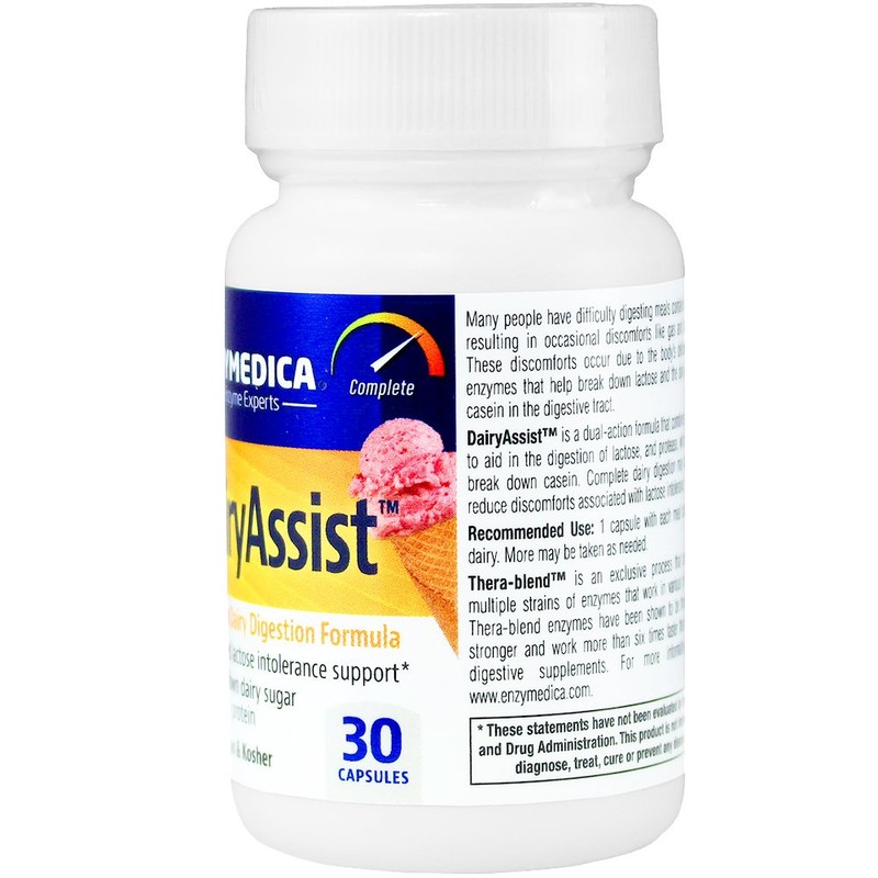 Enzymedica's Dairy Assist combines lactase to break down lactose into galactose and glucose for easy absorption into the blood stream and Protease Thera-blend contains multiple strains of protease for digesting proteins. This dual-action formula'supports the digestion of both dairy sugar (lactose) and dairy protein (casein). Dairy intolerance can be a complex issue. Food intolerance reactions are caused by a deficiency of digestive enzymes. When one is lactose intolerant, they are deficient of lactase, the enzyme produced by the body to break dairy sugar down into glucose, a simple sugar that can be easily absorbed. When there is not enough lactase in the digestive system to digest the mount of lactose consumed, the body retains water in the bowel. The result may be uncomfortable cramps, occasional bloating and diarrhea. Symptoms usually occur 30 minutes to two hours after ingesting dairy foods. Lactose intolerance impacts as many as 50 million Americans. Some causes of lactose intolerance are well known. For instance, certain digestive diseases and injuries to the small intestine can reduce the amount of enzymes produced. In rare cases, children are born without the ability to produce the enzyme lactase. For most people, however, lactase deficiency develops with age. Individuals who believe they are lactose intolerant may be reacting to the milk protein, casein. Casein is the main protein found in milk and is also used in many food products'as a binding agent. The reaction for a casein intolerance is usually less severe and takes a bit more time to appear. Gastrointestinal problems, such as occasional diarrhea, bloating and abdominal cramps, are common symptoms of a food intolerance, but some people can also experience joint pain, fatigue and behavioral changes.