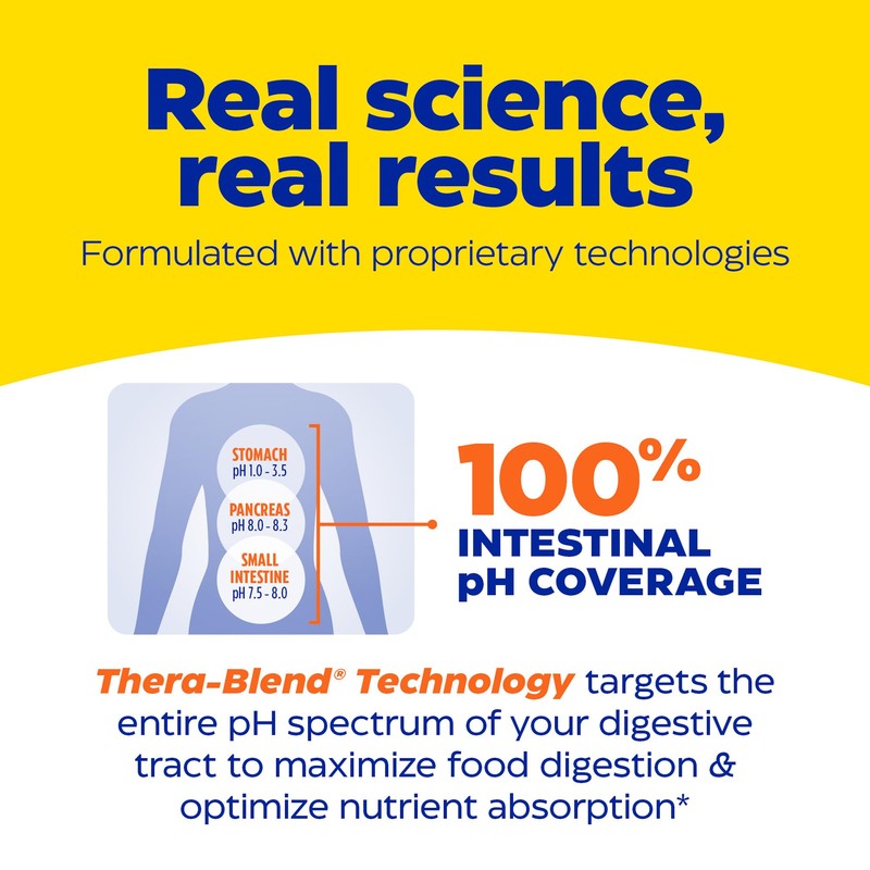 - Powered by thera-blend: Experience faster relief and better digestion thanks to Thera-blend enzymes, formulated to stay active through acidic and neutral environments in the digestive system