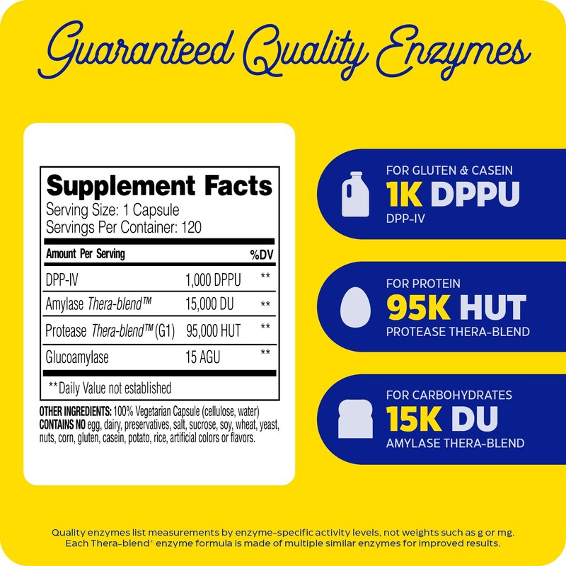 - Specialized protection: Reduce occasional bloating and gas with help from the protease enzyme, DPP-IV; Amylase enzymes target gluten-rich carbohydrates in grains