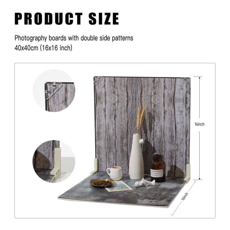 - DUAL SIDE BACKGROUND BOARDS - These 16x16 INCH backdrop surface boards are the best size for displaying all your product, High-precision printing, real three-dimensional texture, not easy to wrinkle, non-reflective and waterproof