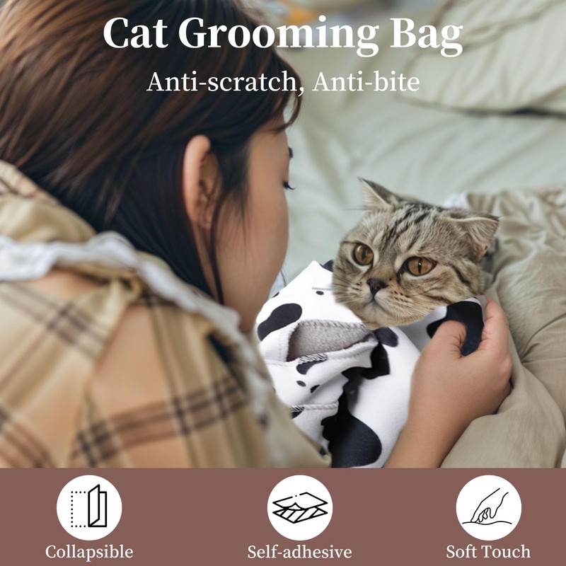 EOAMGO Cat Wrap for Cutting Claws, Self Adherent Cat Grooming Bag Cat Wrapping Cloth, Anti-Scratch, Anti-Bite, Restraint Cat Blanket for Ear Canal Cleaning, Medicine Feeding (S, cow)