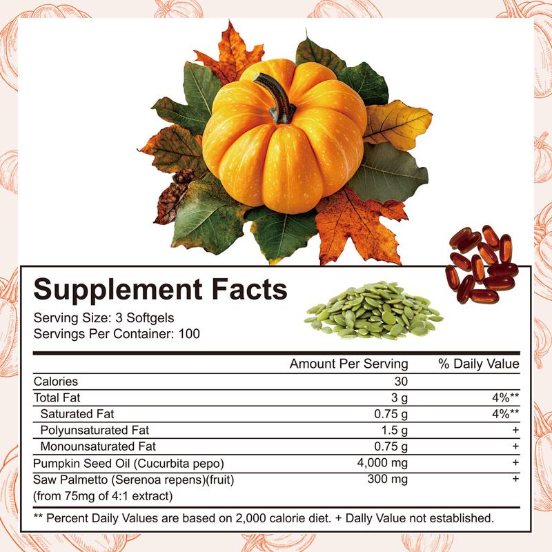 🎃🎃 Each pouch offers 300 softgels with a 3 softgel serving size, contains 4,000mg pumpkin seed oil with 300mg saw palmetto oil 4:1 extract per dose, up to a 100-day supply.