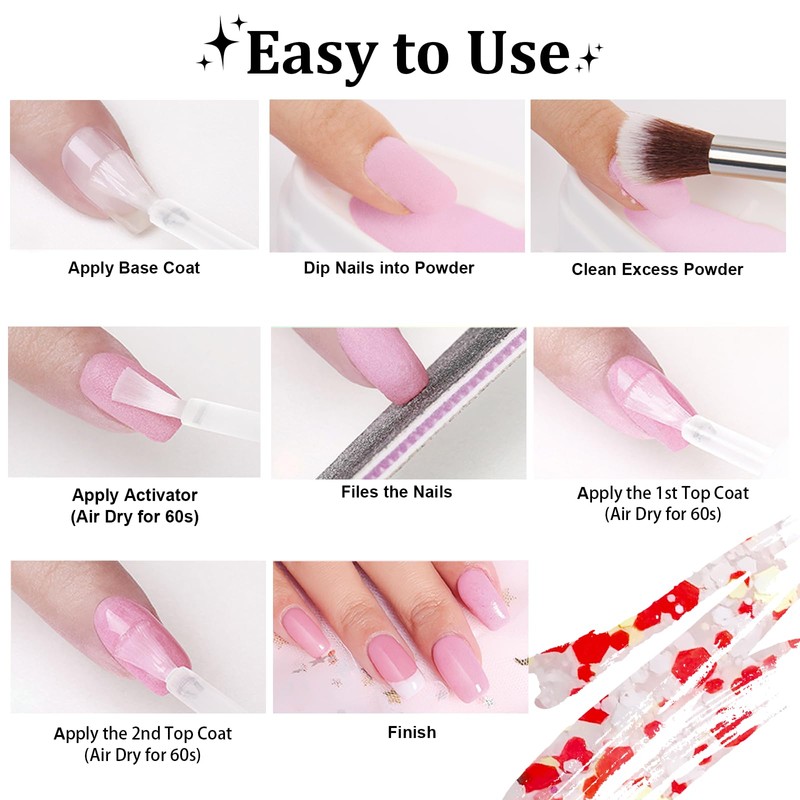 - 【No Nail Lamp Needed】Simply dip your nails into our nail dip powder, covering them completely. With quick drying properties, there's no need for a nail lamp, saving time and preventing skin darkening and nail damage.