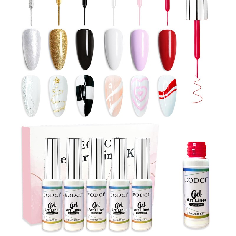 eodci Nail Art Liner Set 6 Pcs Black White Red Gold Silver Glitters Colors Paint Swirl Built Thin Brush in Bottle Soak off Led Lamp Gel Liner Nail Polish Manicure Kits