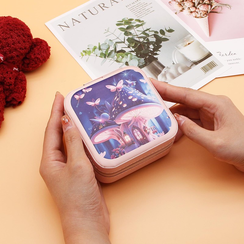 EOGOW Mushroom Theme Small Travel Jewelry Case, Pink, Whimsical, Waterproof, Zipper Closure, 4x4x2 Inches, 11 Compartments