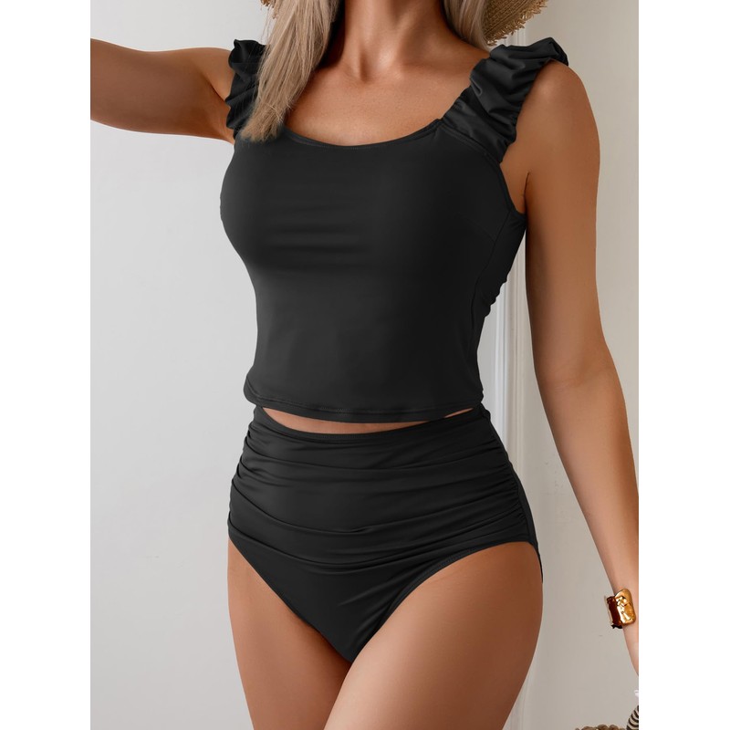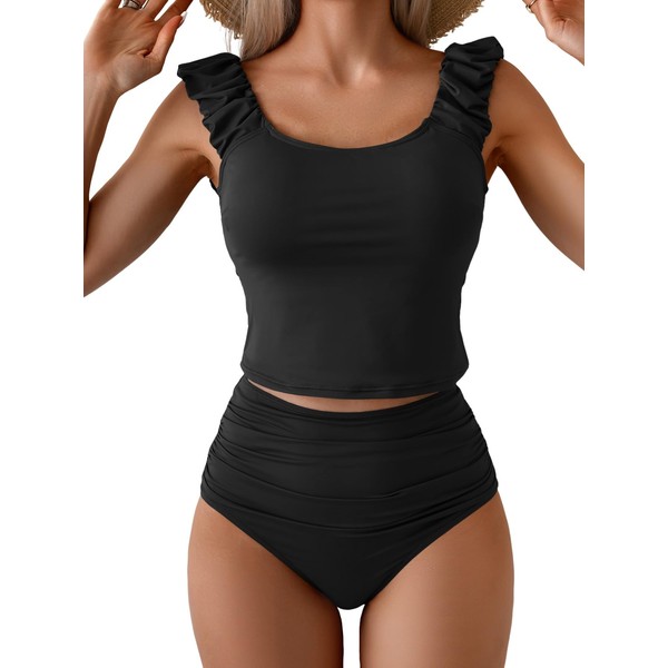 Eomenie Tankini Swimsuits for Women Ruched Tummy Control Bathing Suits Two Piece Swim Tank Top with High Waisted Bottom Black