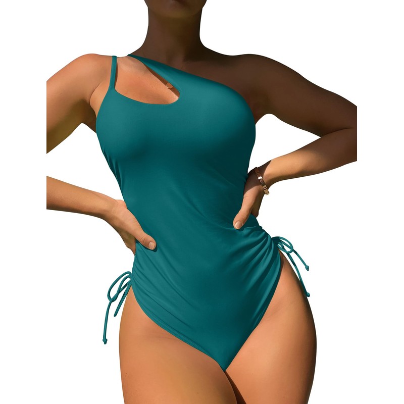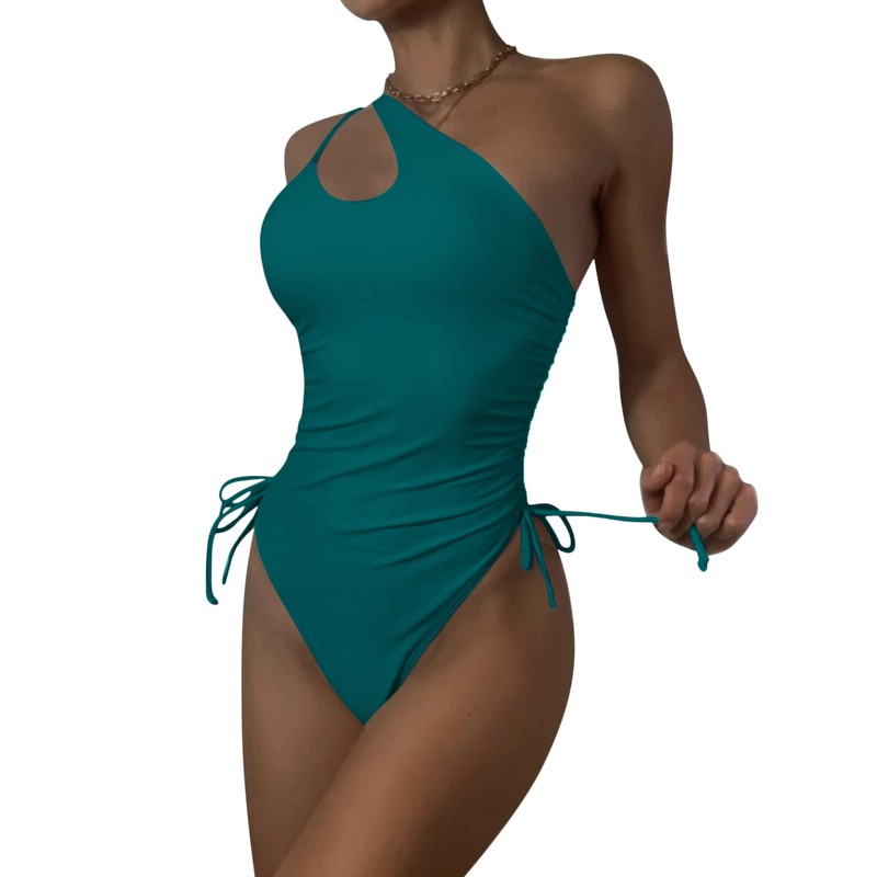 Eomenie - Traje de baño de una pieza con un hombro para mujer, sexy, corte alto, con lazo lateral, control de abdomen y cordón, verde azulado, XL