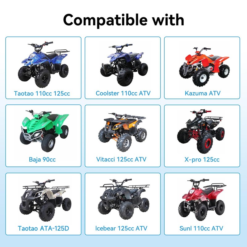 - Compatible with: 125cc ATV wiring harness kit is compatible with Taotao 70cc-125cc ATV (ATA-125D, Boulder B1, T-Force, Cheetah, ATA-110B, ATA-110D, ATA-110F, ATA-110H, ATA-110L, ATA-125A, ATA-125F1, ATA-125G, ATA1-125H), Coolster 110cc 125cc (3050B, 3050C, 3050D, 3125B, 3125C, 3125R, 3125X8, 3125XR8, 3125XR8-S, Mountopz 125cc), Venom 125cc, X-pro 125cc, Icebear 125cc, Baja 90, Coleman 125cc, Panther 110cc, Buyang, Coolsport, Kazuma Falcon 90, Redcat, Loncin 50cc, Vitacci 125cc, Atomik