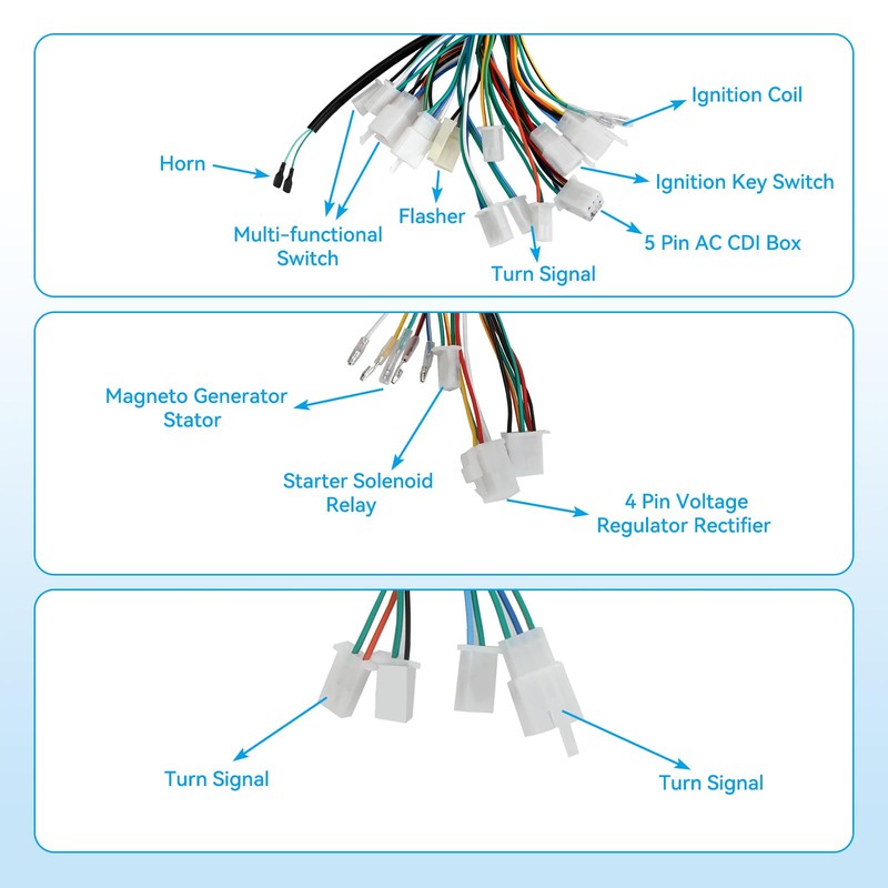 - Tips: Please check your vehicle type before purchasing, this atv wiring harness kit is not suitable for GY6 engine. Please install with the help of professionals, incorrectly installed machines will not function properly