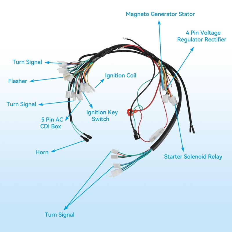 - Package Includes: 1 x 110cc ATV Wire Harness, 1 x Ignition Coil, 1 x 5 Pin AC CDI Box, 1 x Starter Solenoid Relay, 1 x Spark Plug, 1 x Voltage Regulator Rectifier, 1 x Ignition Key Switch, 1 x Upgraded Multi-functional ATV Switch (8 wire 3 function), 1 x Stator (Magneto Generator), 1 x Fuse, 4 x Turn Signals, 10 x Cable Ties, 1 x Horn, 1 x Flasher, 1 x Fuel Line, 2 x Fuel Filters, 4 x Clamps