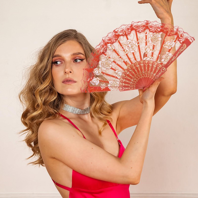 This folding fan features traditional fabrics anda premium plastic frame. With a sturdy structure and an elegant lace floraldesign, our folding fans will become the first choice of party accessories.