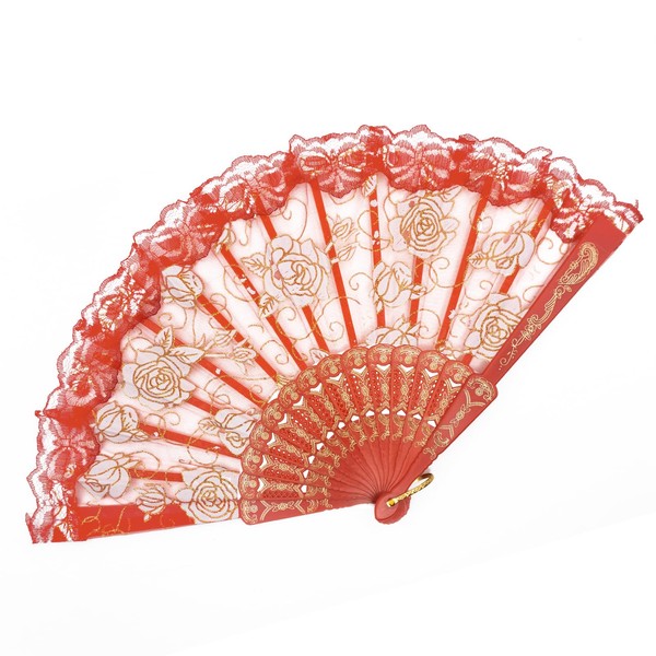 EOSAU Handheld Chinese Folding Fan Lace Hand Fans for Women Foldable Bulk for Party Wedding Church Dancing (Red)