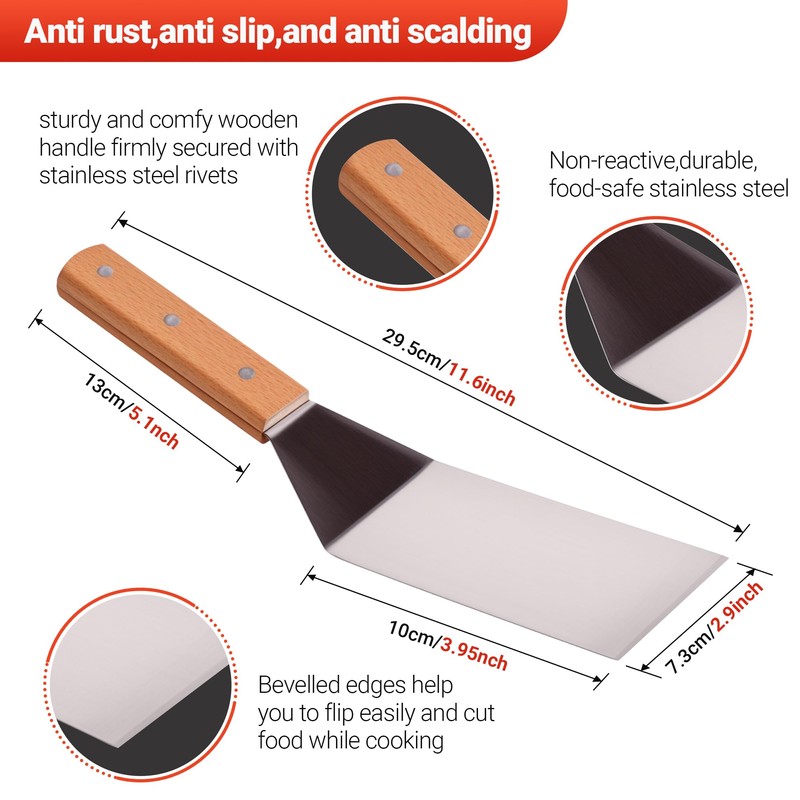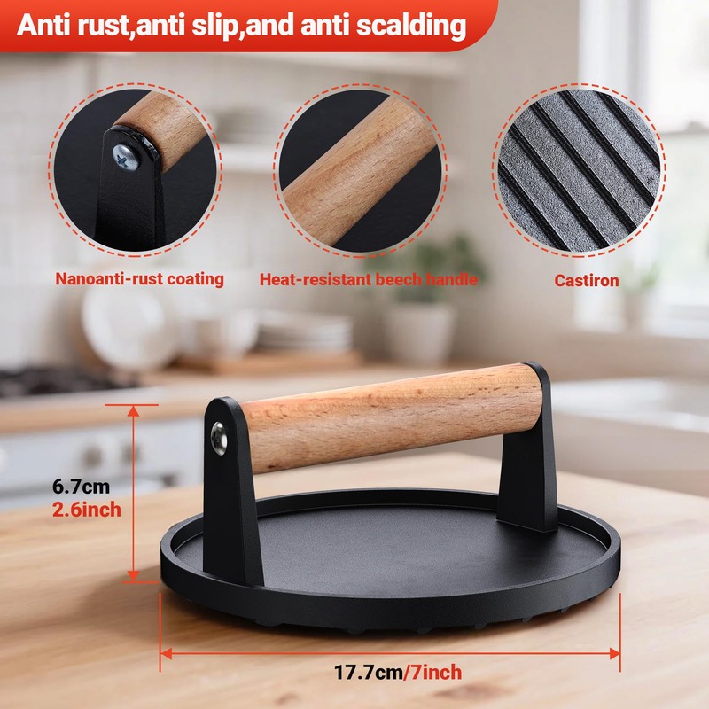 - Safe-Touch ,Comfort-Grip Wood Handle: Wooden handle, has ergonomic design to reduce hand fatigue and protect your hand from burning while ensuring a secure and comfortable grip. Made of natural wood, the handle of meat press,kitchen tongs and hamburger spatula are smooth without any burrs, insulate heat transfer that's heat-proof and always remain cool to touch.