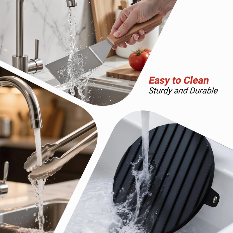 - Premium Stainless Steel Burger Spatula and kitchen Tongs:This heavy-duty stainless steel spatula effortlessly flips, scrapes, and smashes burgers with precision—its sharp edge glides under patties without sticking, while the reinforced design ensures even pressure for the perfect sear.Cooking tongs have a ring pull locking mechanism, pull the ring for lock to save space, and push for open can be one-hand opration. Also include a hanging ring for easy hang and storage.