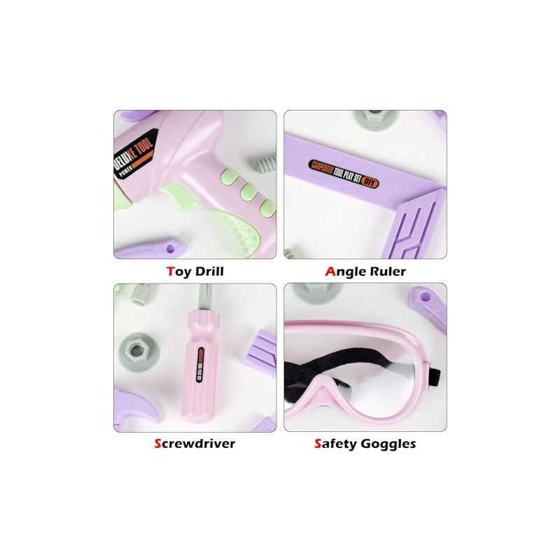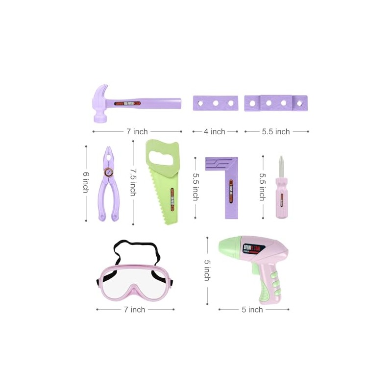 • TOY TOOL SETOur toddler tool set includes pretend electric chainsaw,electric jig saw,drill with 3 different interchangeable bits,saw bit,drill bit,real tape measure,hand plane,hammer,handsaw,helmet,goggles,face mask,earmuffs.