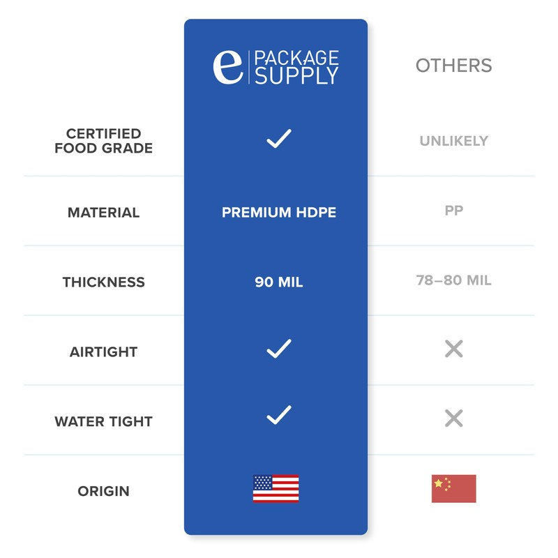 - DURABLE AND HEAVY DUTY - Made with high-grade HDPE plastic, our BPA-free buckets are made to last. Perfect for a wide variety of foods including soup, kitchen storage, meal prep, flour, deli meats and rice storage. They are dishwasher and microwave safe.