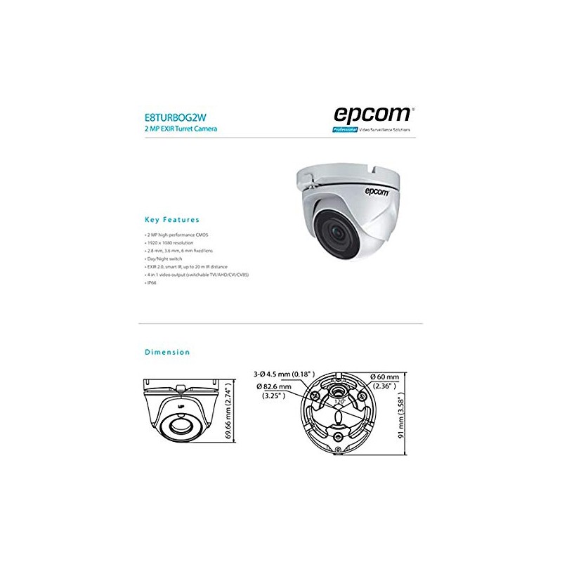 EPCOM Camara Turret TURBOHD E8-TURBO-G2W 1080p METÁLICA Gran Angular 103° Lente 2.8 mm IR EXIR Inteligente 20 MTS Exterior IP66 TVI-AHD-CVI-CVBS dWDR