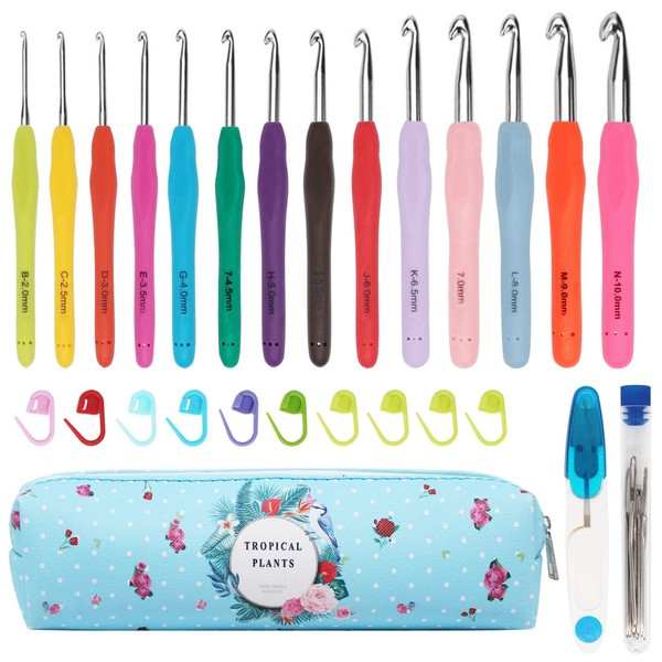 - Crochet Set Contents: 14 x Knitting Needles, 10 x Number of Tiers, 1 x Scissors, 9 x Sewing Needles, 1 x PU Bag. Even beginners can weave it smoothly, without any extra snags when weaving