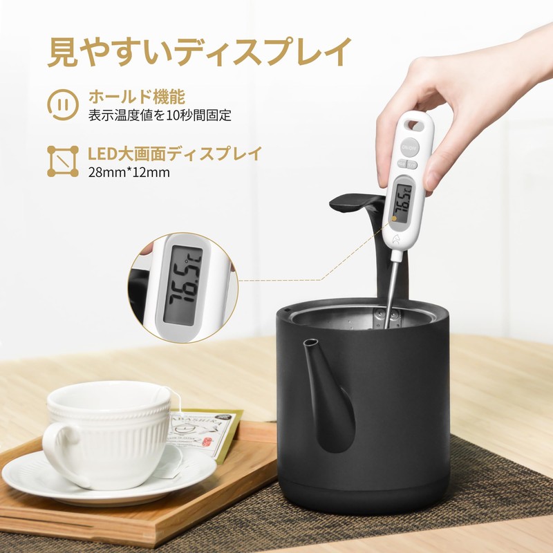 - Long probe with 5.5 inches (14.1 cm) and easy-to-read display: The probe portion is 5.5 inches (14.1 cm) long, so your hands won't get hot even when near heat sources. The holding function is designed to hold the measurement by pressing the "HOLD" button when you want to keep it away from the object