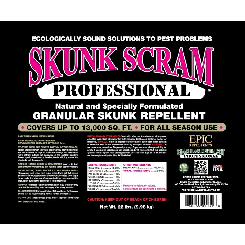 - EPIC SKUNK SCRAM PROFESSIONAL -- America’s Finest granular skunk repellent -- is specifically designed to stop and prevent damage caused by skunks.