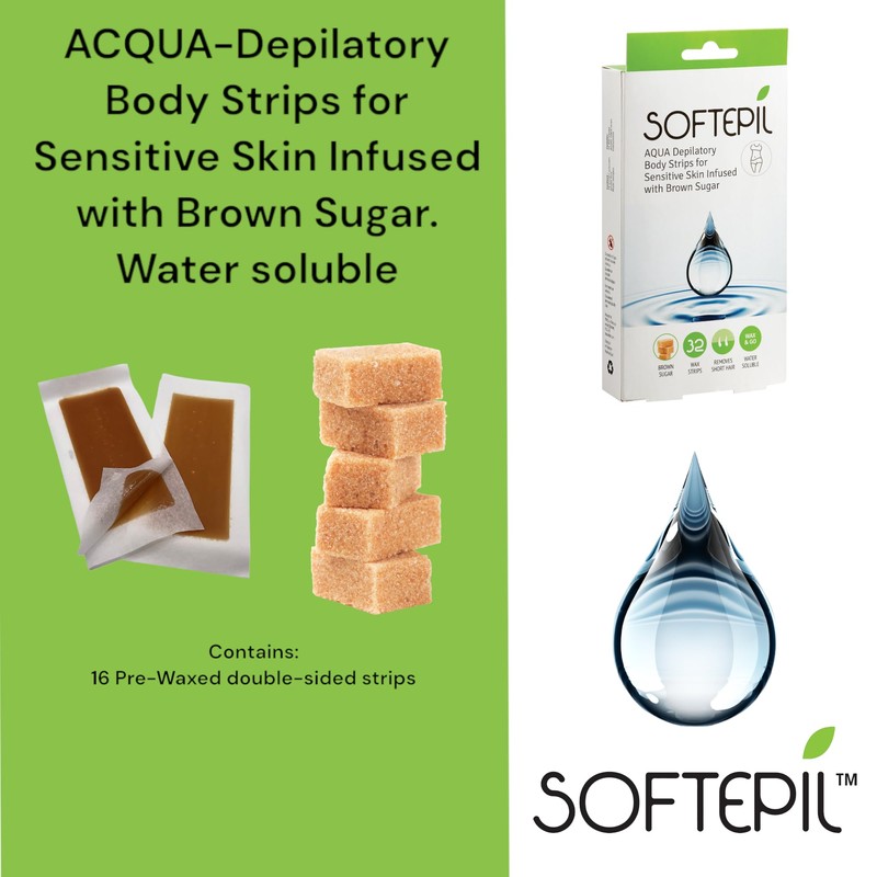 Epildou - Softepil lot de 32 bandes dépilatoires pour le corps (peau sensible) avec sucre brun naturel, soluble à l'eau pour nettoyer facilement les résidus