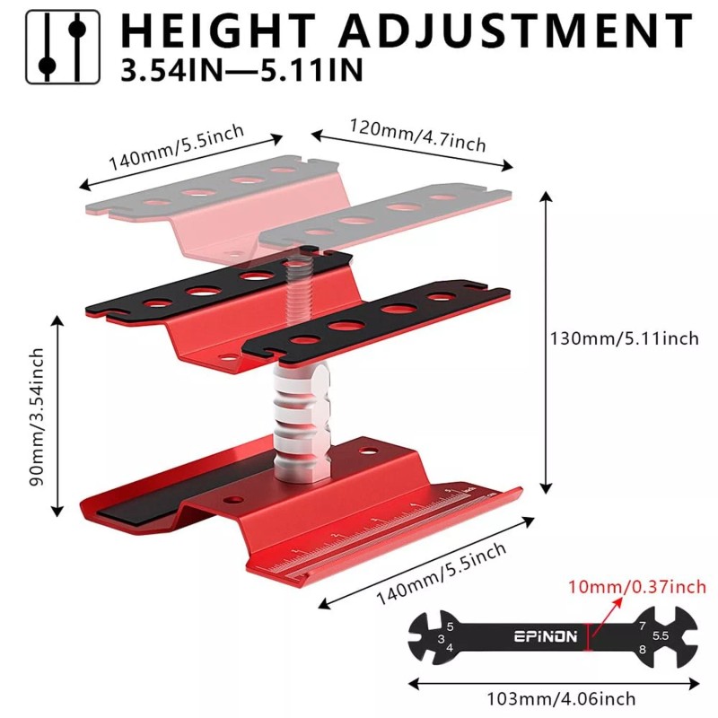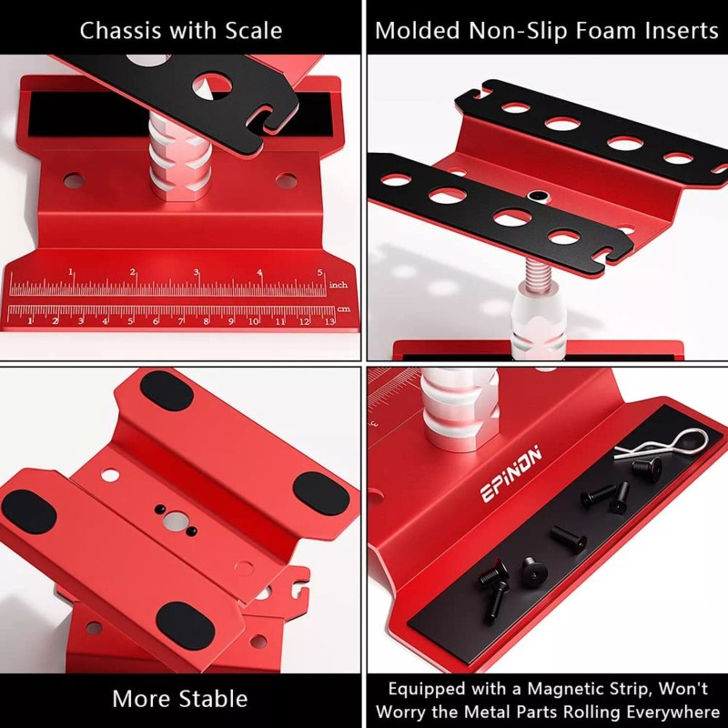 - Adjustable RC StandRC work stand can adjust the height from 3.54inch to 5.11inch. 360-degree rotation, chassis with scale, you can measure the length of the parts.