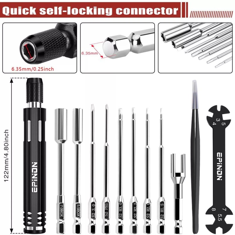 - RC Screwdriver HandleMade of aluminum, 6.35 quick self-locking connector, can be loaded and unloaded more conveniently and quickly screwdriver bit, a more secure connection.