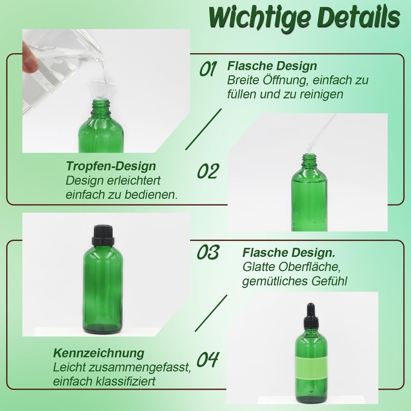 - Mehrzweck: 100ml Pipettenflaschen sind sehr geeignet für ätherische Öle, Kräuterextrakte und Mischungen, Parfüm, Apothekerflaschen und Labortropfenflaschen. Glasflaschen mit ätherischem Öl können wiederverwendet werden, wodurch Ressourcenverschwendung und Umweltverschmutzung reduziert werden.