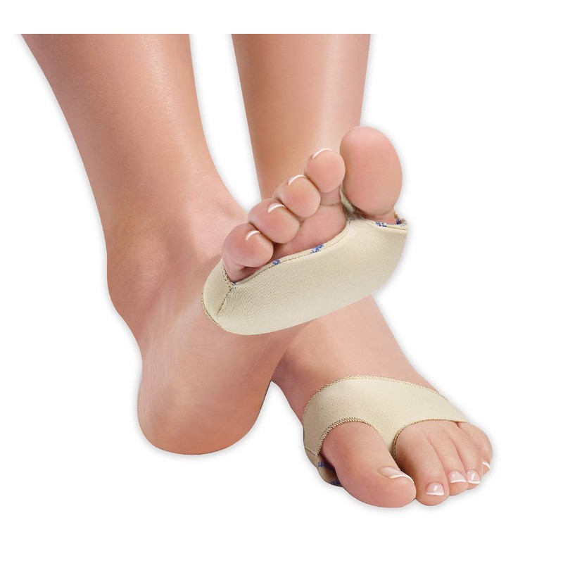 The protective bandage for hallux valgus on the foot protects the bunion from pressure and friction in the shoe. This reduces pain and prevents callus formation.