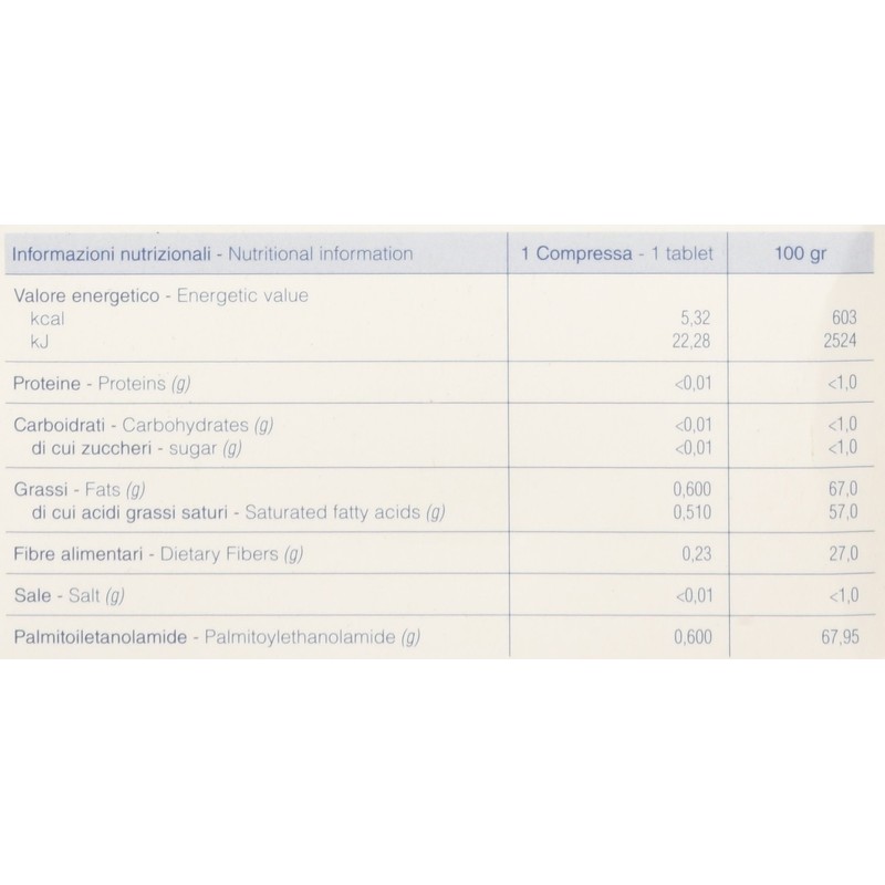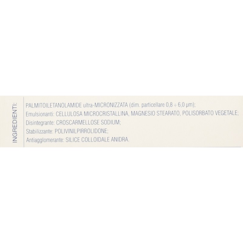 Micronized palmitoylethanolamide; excipients: microcrystalline cellulose; croscaramelose; povidone; magnesium stearate; colloidal silicon; polysorbate 80.