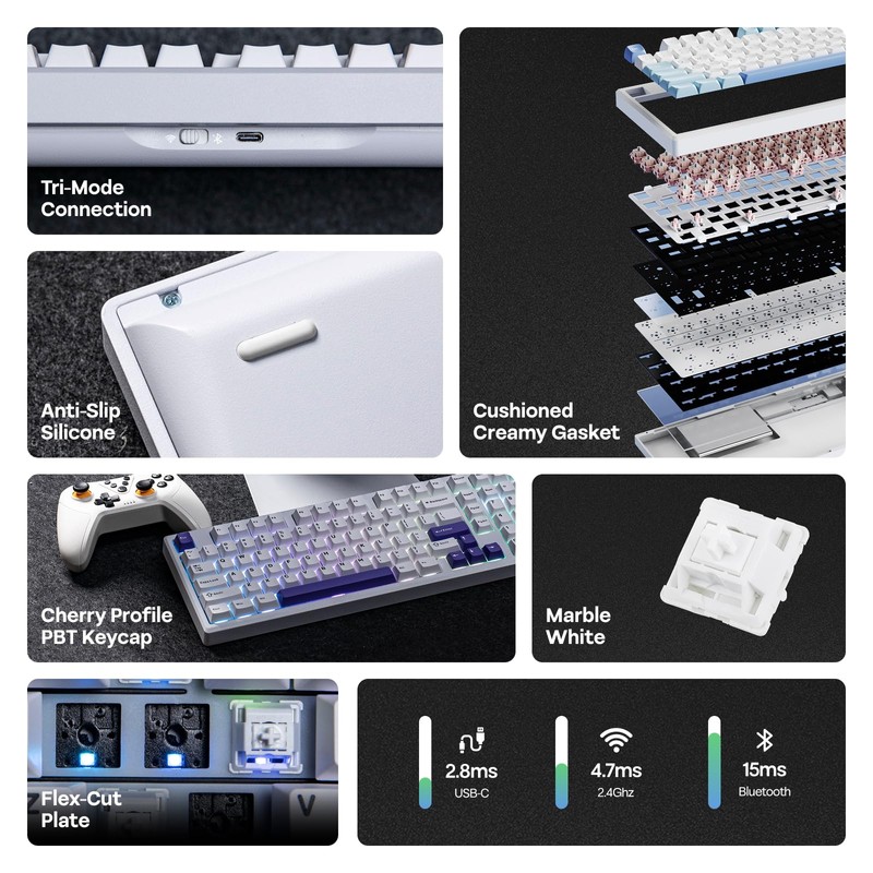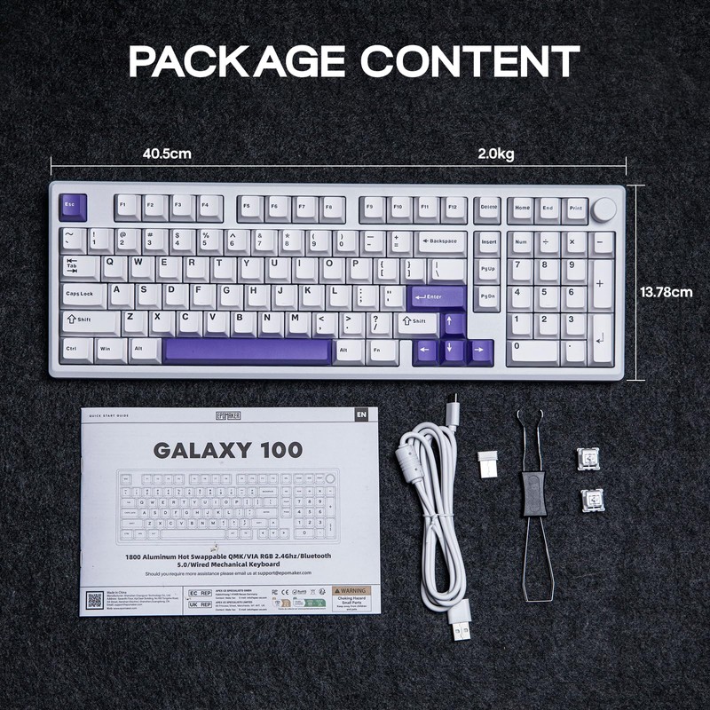 - Pre-Lubed Hot-Swappable Linear Switches: Lubed in factory, the Galaxy100 keyboard houses linear marble switches that sounds as gentle and enjoyable as mellow marbles. With the cushioned Gasket-Structure, the typing sound is dampened to a soft thud perfect for various using scenarios. The Galaxy100 Keyboard also comes with hot-swappable PCB and a 2-in-1 switch puller, for keyboard enthusiasts to test out different switches seamlessly and effortlessly. No more soldering iron, as a switch swap can be as simple as a pull and push.