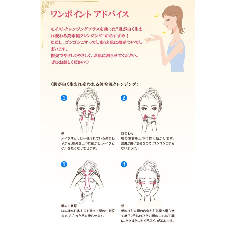 • Formulated with "Hematococococcus Pluvia Lis Extract", "Aloe Vera Extract", and "Rosemary Extract", and the natural beauty oils such as komenuka oil and corn oil will quickly remove makeup while touching your skin