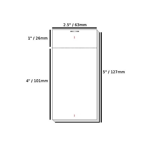 - Approximate Dimensions: 2.5" x 5" (4" tear out) / 63mm x 127mm (101mm tear out)