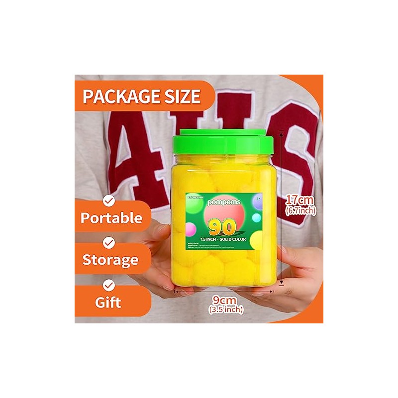 - Excellent Choice: You'll get a jar of easy-to-carry pom poms, packaged in a jar that is easy to store and would also be perfect for festival present. Each pack of 90 pom poms comes in a wide range of colors,and choices you need. 1.5 inch yellow pompoms suitable for many craft projects