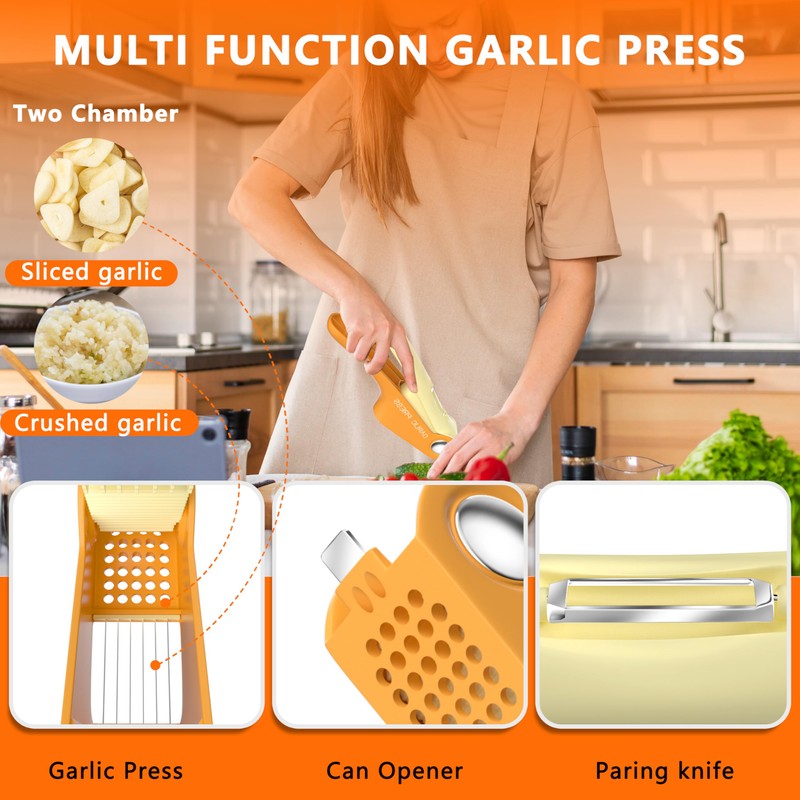- 3 in 1 Multi-Functional Garlic Slicer Set:We are a 3 in 1 multi-functional garlic slicer: excellent for slicing garlic, peeling vegetables with one cut to the end, extra garlic press function.