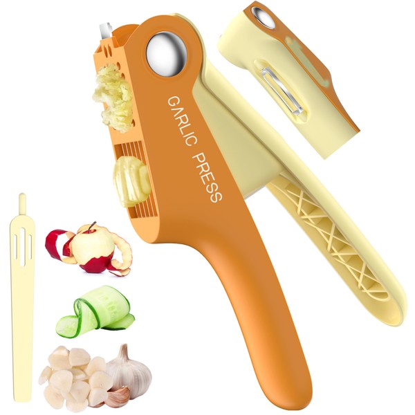 Epritliber Garlic Slicer, 3 in 1 Garlic Slice,Vegetable Peeler,Garlic Press with Garlic Cleaner, Efficient Garlic Slicer Super Thin-Easy to Squeeze Clean,Stainless Steel Blades and Sturdy ABS, Orange