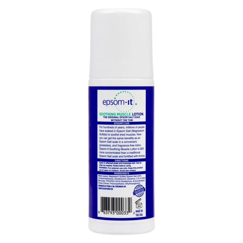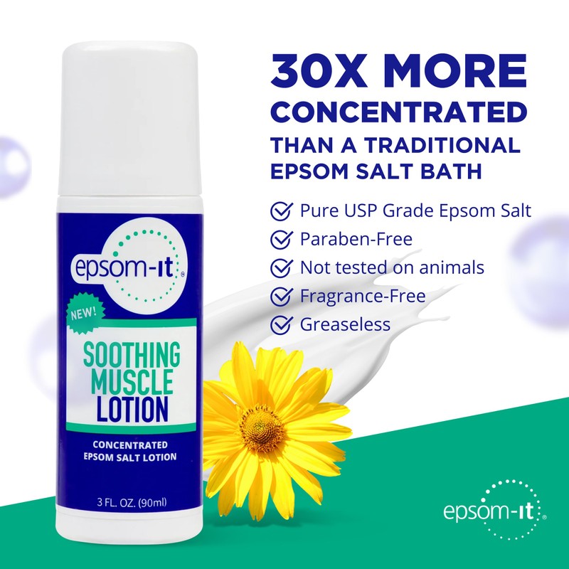 - Epsom Salts, Anytime, Anywhere - Skip the tub and enjoy the soothing benefits of Epsom salt in lotion form! Epsom-It magnesium lotion is 30x more potent than a traditional Epsom Salt bath soak with a 20% concentration of 100% pure USP Grade Magnesium Sulfate.