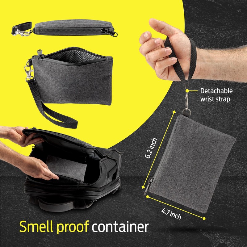 - STYLISH DESIGN SMELLPROOF BAG - This small smell proof bag features a high-quality zipper closure for enhanced odor-blocking and a removable carry strap. Designed in a sleek heather gray, this scent proof bag combines style and functionality.