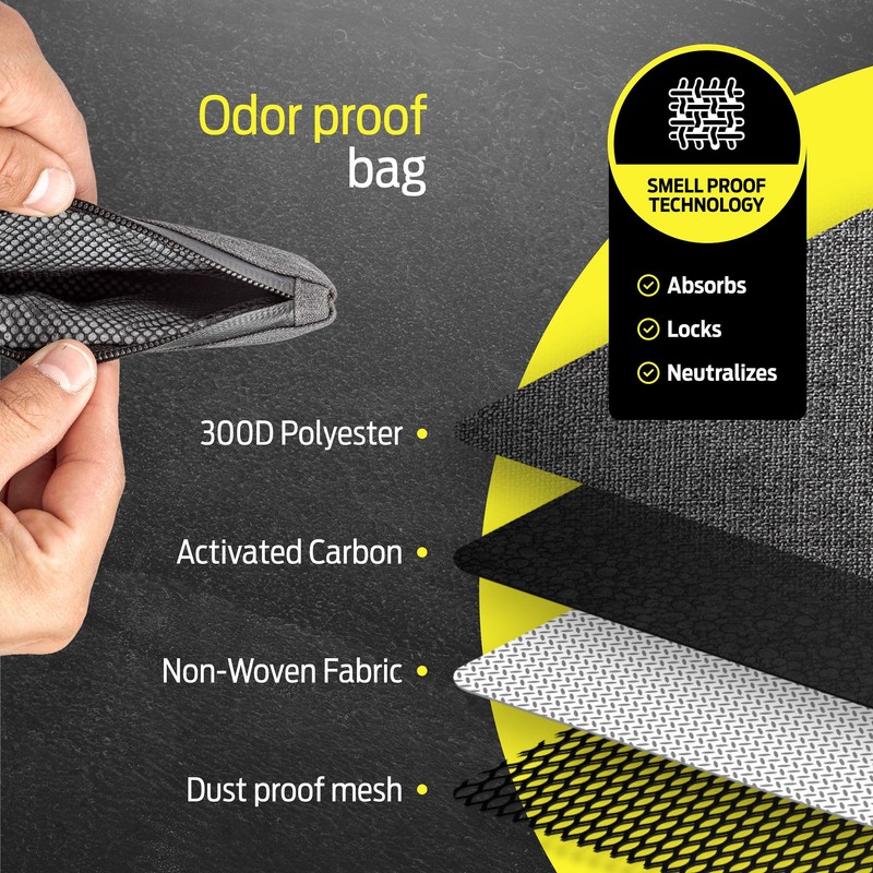 - ODOR PROOF TECHNOLOGY - This smell proof bag features an activated carbon fiber lining, ensuring maximum odor containment. A top-tier smell proof pouch perfect for discreetly storing smoking accessories.