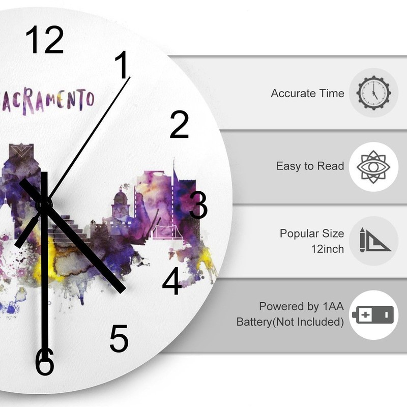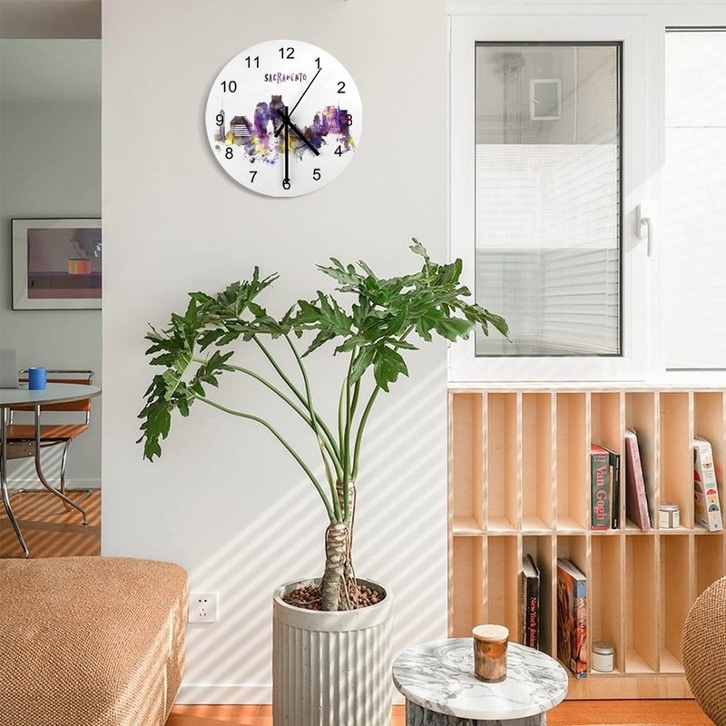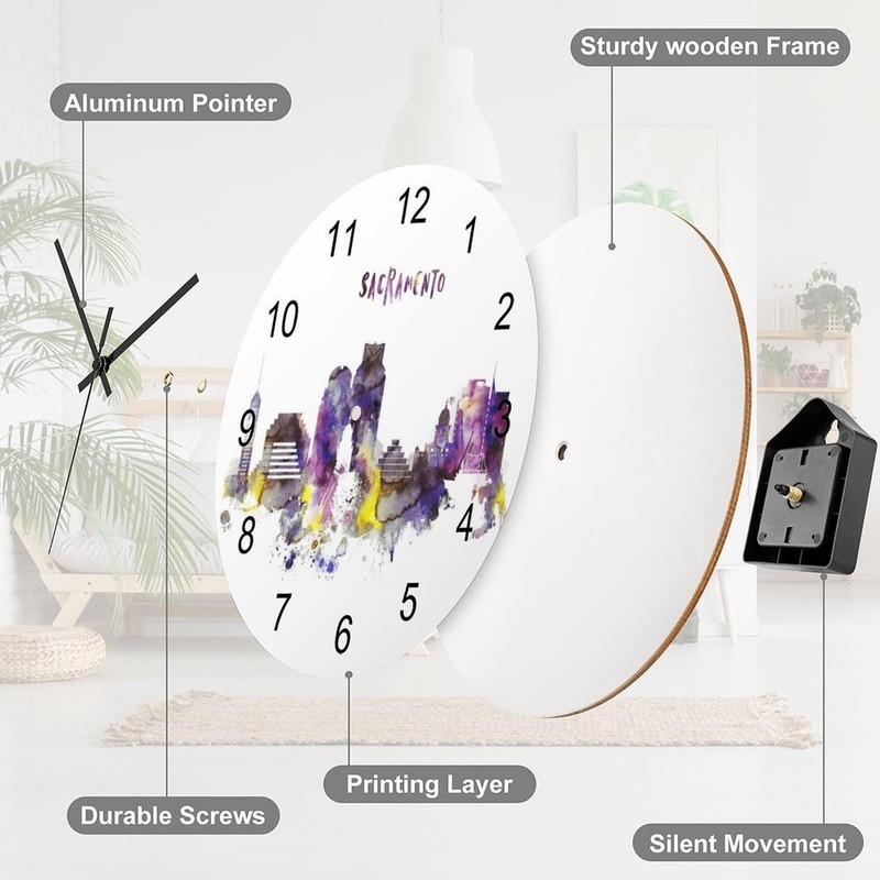EQEY Sacramento Cityscape Skyline Wall Clock Silent Non Ticking Round Home Decor Wooden Wall Clock Round Easy to Read for Home Office School Clock, 12 Inch