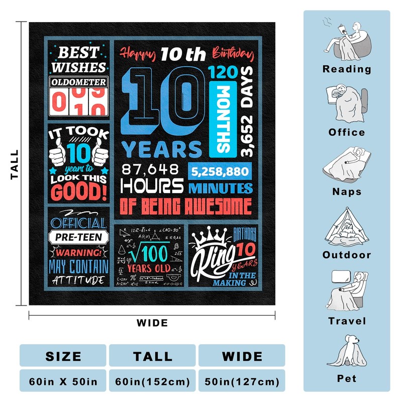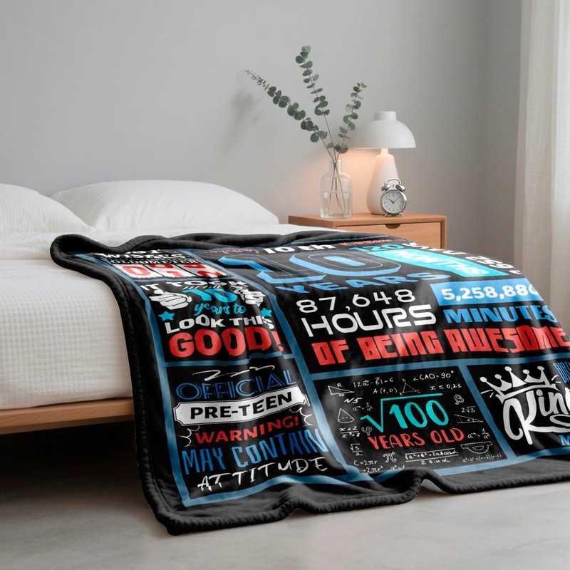 - 10 Year Old Boy Gifts: Searching for 10-year-old boy gifts that feel personal? This cozy throw is crafted to celebrate his milestone birthday. It’s not only comfortable but also makes a fun and vibrant addition to birthday party decorations, wrapping him in warmth and the excitement of turning ten. Perfect among 10-year-old boy birthday gifts, it’s a thoughtful and practical present that stands out.