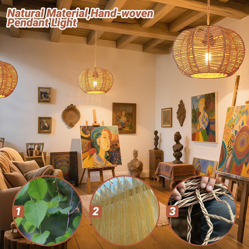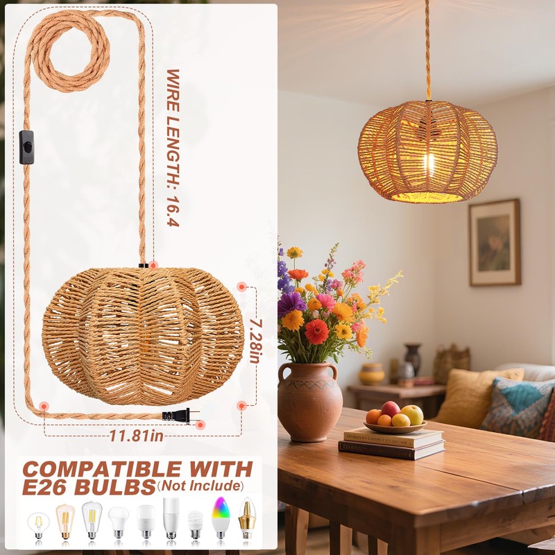 • Plug in Pendant Light with E26: The rattan shade provides a unique and beautiful light to brighten up any living space; The hanging pendant light is designed with a standard medium-sized E26 base that allows you to use a variety of bulb types, whether you prefer incandescent, LED, CFL, or halogen lamps, this is the light for you.