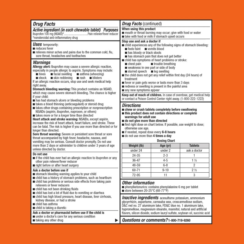 • Pain Reliever and Fever Reducer: Children's Ibuprofen Chewable Tablets reduce fever and relieve minor aches and pains due to the common cold, flu, sore throat, headaches and toothaches.