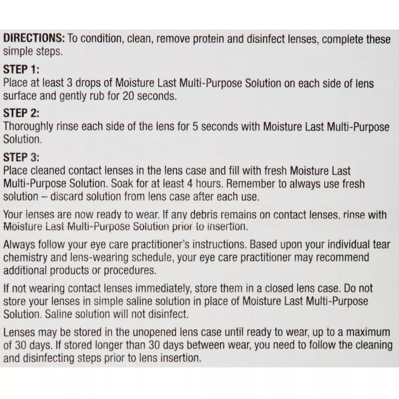 Your eyes will thank you for using Equate Moisture Last solution for soft contact lenses. It is also safe to use with silicone hydrogel lenses. This Equate contact solution cleans and conditions your lenses for a fresh feeling. It will also remove proteins that can build up over time if not cleaned properly. The disinfecting properties of the solution will help keep germs from entering your sensitive eye area.This multi-purpose solution provides 16+ hours of moisture for a more comfortable contact lens experience.