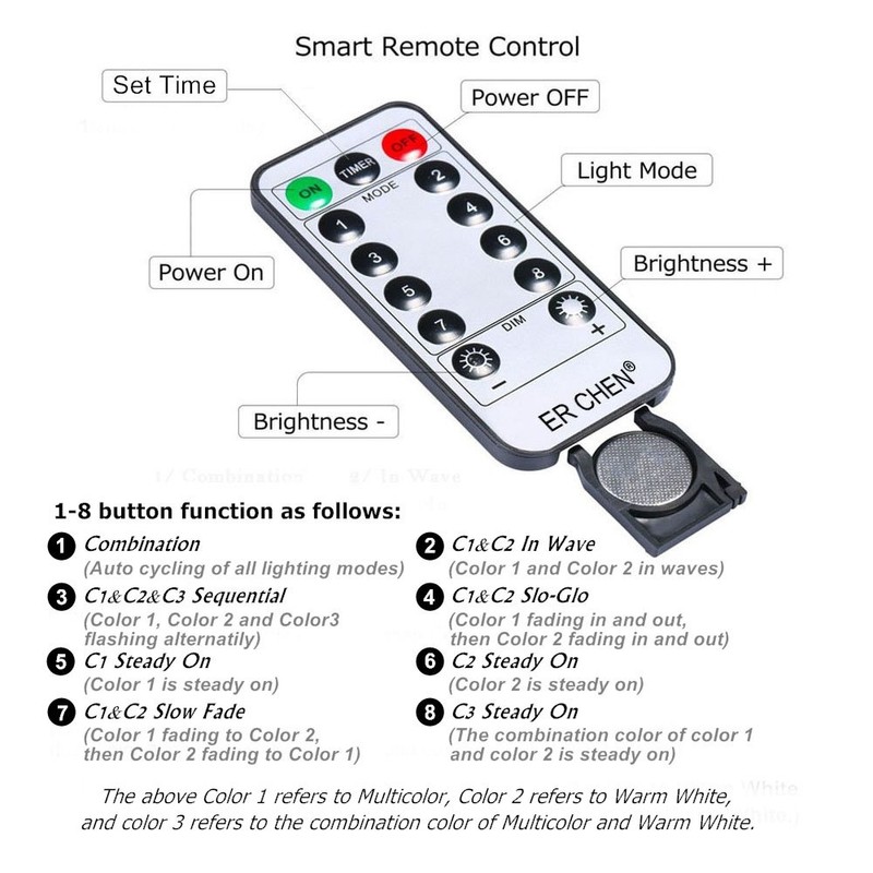 - đăRemote Control and Timer FunctionăUse the 13 keys remote control for easy operation. Remote control range 9-16ft/3-5M. You can also adjust the brightness or switch between 8 lighting modes: Steady on 3 different colors, color alternating in slow fade, color transforming, color changing in flash and so on. The string lights will be auto turned on and off every day after you set the timer.