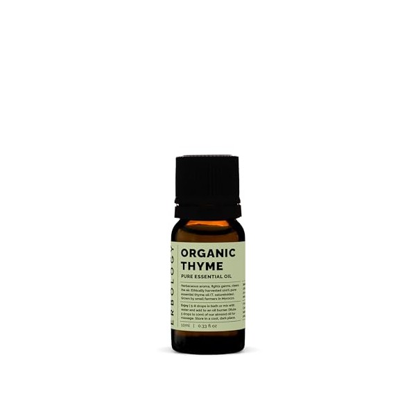 Product descriptionAbout ErbologyHi! We are Erbology. We make healthy, organic, plant-based foods that make you feel good.We have scoured the world for the most exciting, nutritious ingredients. We source them sustainably from small, independent farmers and use minimal processing to make sure they get to you in their purest and most powerful form.IngredientsEthically harvested 100% pure essential thyme oil (T. satureioides). Grown by small farmers in Morocco.DirectionsEnjoy 5-8 drops in bath or mix with water and add to an oil burner. Dilute 5 drops to 10ml of our almond oil for massage.Safety WarningAvoid contact with skin. Dilute before use. Keep away from heat and open flames. Do not ingest.
