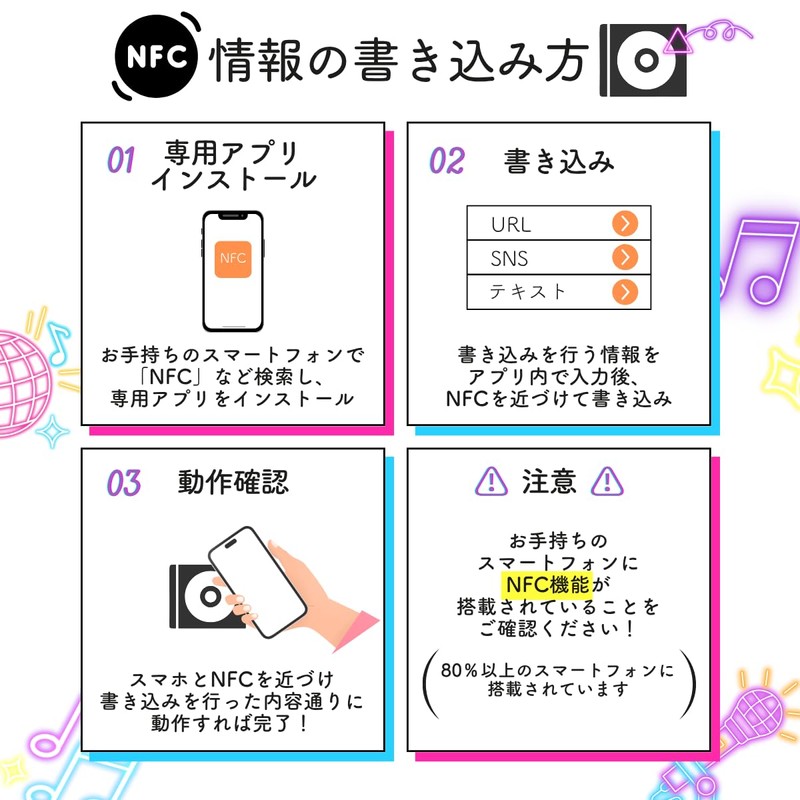- Very easy to use. 1. Write data on the smartphone app, etc. 2. Set your favorite information such as URL, SNS, and text. 3. Then just touch your smartphone. An NFC-compatible smartphone is required for writing/reading