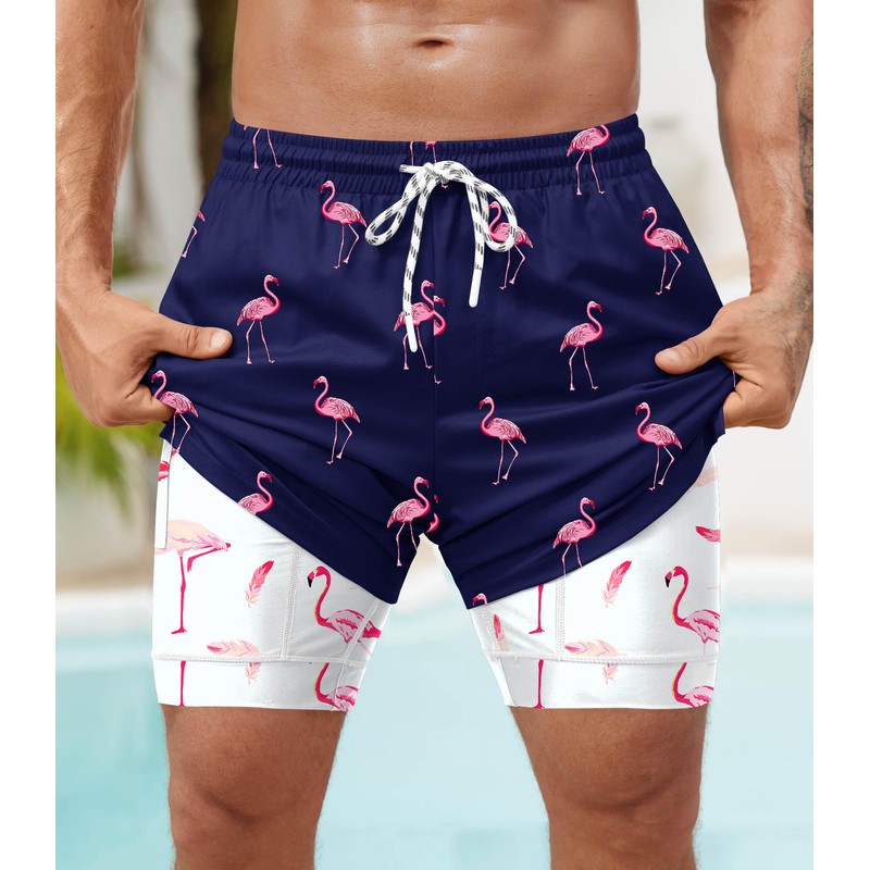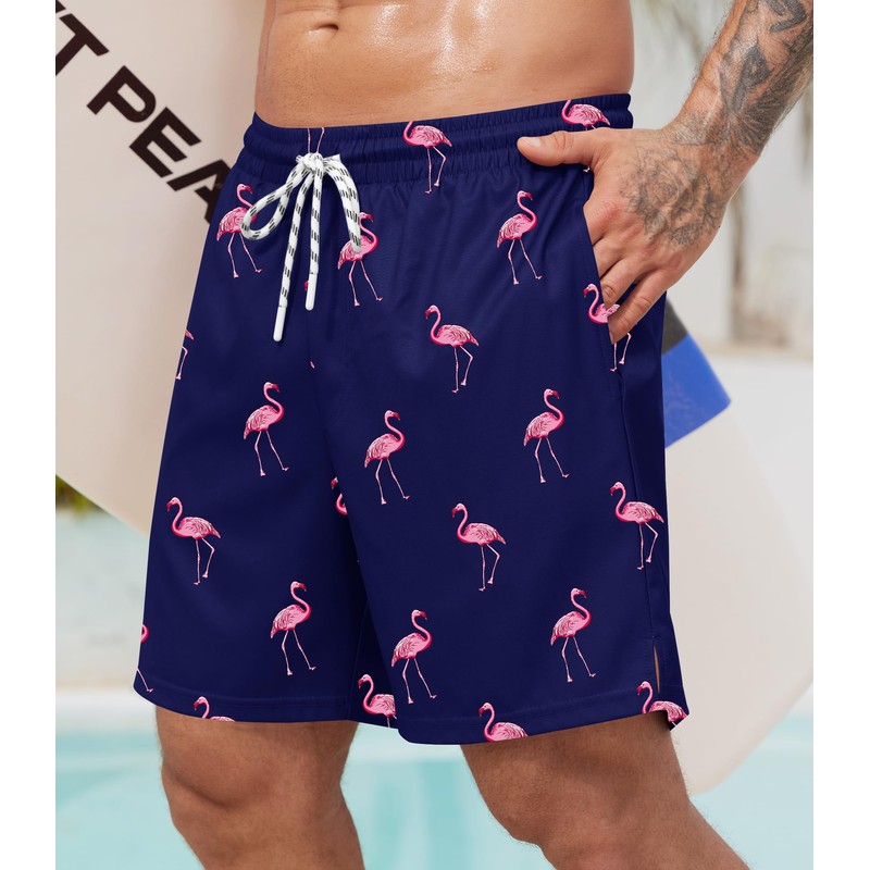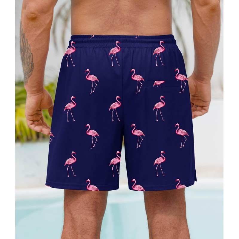 ERECT PEAK Men Flamingo Swimwear Summer Swim Trunk Liner Beach Waterproof Hawaiian Stretch Graphic Short Navy S