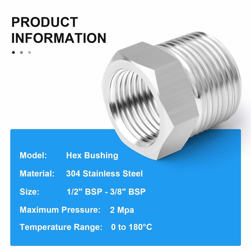 ERGAOBOY 10 Pcs 304 Stainless Steel Reducer Hex Bushing, 1/2" BSP Male to 3/8" BSP Female Pipe, Reducing Adapter Fitting Converter