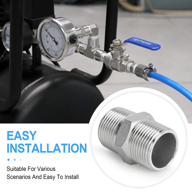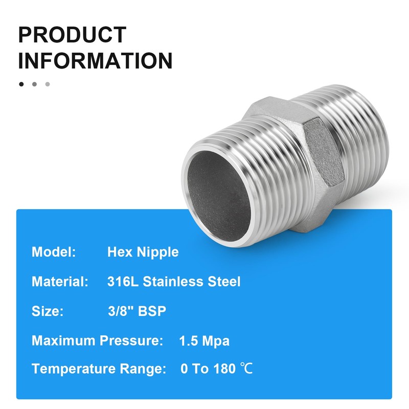 ERGAOBOY Pack of 2 Stainless Steel 316L Hexagonal Fittings with Male Thread, Pipe Fitting 3/8 Inch BSP Male Thread x 3/8 Inch BSP Male Thread